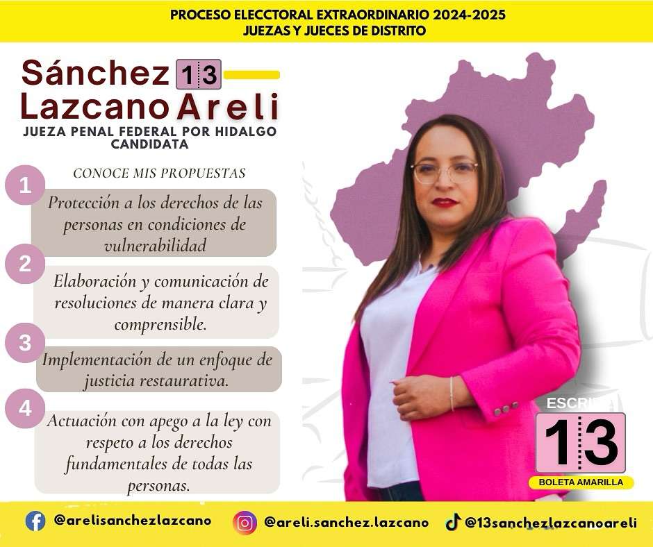 Propuesta por el Poder Ejecutivo Federal, la juez Areli Sánchez Lazcano busca el apoyo ciudadano para poder ser investida como Juez del Distrito 29 en Hidalgo en las históricas elecciones mediante las cuales, los perfiles del Poder Judicial de la Federación llegarán, por vez primera, por consenso del pueblo.