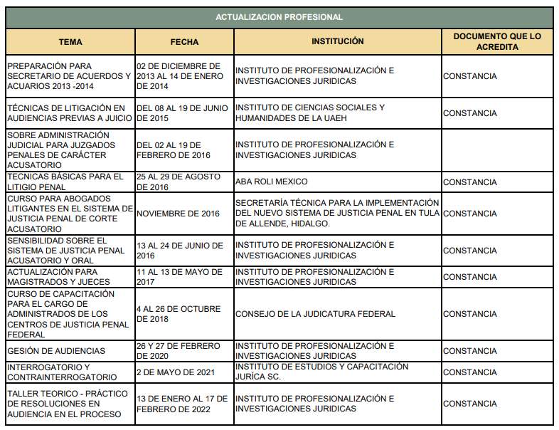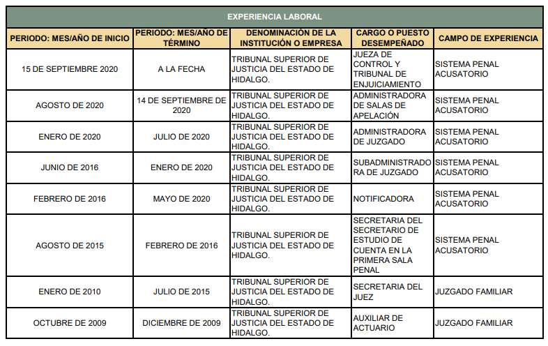 Con más de 15 años de experiencia en el Tribunal Superior de Justicia del Estado de Hidalgo, 6 de ellos los desempeñó en Juzgados familiares como auxiliar de actuario y secretaria del juez. Los 9 restantes los hizo en el Sistema penal acusatorio, donde fue secretaria de estudio de cuenta en la primera sala penal, notificadora, subadministradora de juzgado, administradora de juzgado, administradora de salas de apelación, y finalmente, Jueza de control y tribunal de enjuiciamiento.